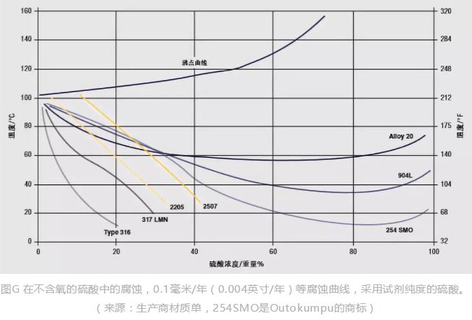 為了說明雙相不銹鋼在強(qiáng)酸溶液中的耐腐蝕性能,圖G給出了在硫酸溶液中的腐蝕數(shù)據(jù)。介質(zhì)條件從低酸濃度的弱還原性環(huán)境到高濃度的氧化性環(huán)境及中等濃度熱溶液的強(qiáng)還原性環(huán)境。