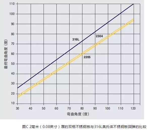 盡管雙相不銹鋼的高屈服強(qiáng)度允許厚度減薄,但由于彎曲和楊氏模量的限制,在制造過程中也會(huì)帶來困難。由于雙相不銹鋼強(qiáng)度較高,其變形需要更大的外力,因此在彎曲操作中的回彈比奧氏體不銹鋼要大,兩種雙相不銹鋼與316L奧氏體不銹鋼回彈的比較見圖C。雙相不銹鋼的延展性比奧氏體不銹鋼差,為避免斷裂需要增加彎曲半徑。