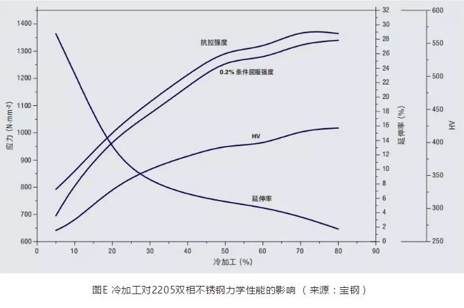 由于雙相不銹鋼較高的硬度和高加工硬化率,與標(biāo)準(zhǔn)奧氏體不銹鋼相比,它降低了機(jī)加工操作中工具的壽命或需要更多的機(jī)加工次數(shù)。在成型或彎曲操作之間可能需要退火,因?yàn)殡p相不銹鋼的延展性差不多是奧氏體不銹鋼的一半。冷加工對(duì)2205雙相不銹鋼力學(xué)性能的影響見圖E。