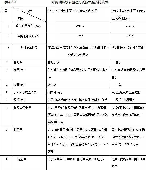 根據(jù)電動(dòng)和汽動(dòng)熱網(wǎng)循環(huán)水泵的結(jié)構(gòu)特點(diǎn),本研究針對(duì)兩個(gè)供熱首站的內(nèi)部情況進(jìn)行了布置,其技術(shù)經(jīng)濟(jì)比較見表4-10: